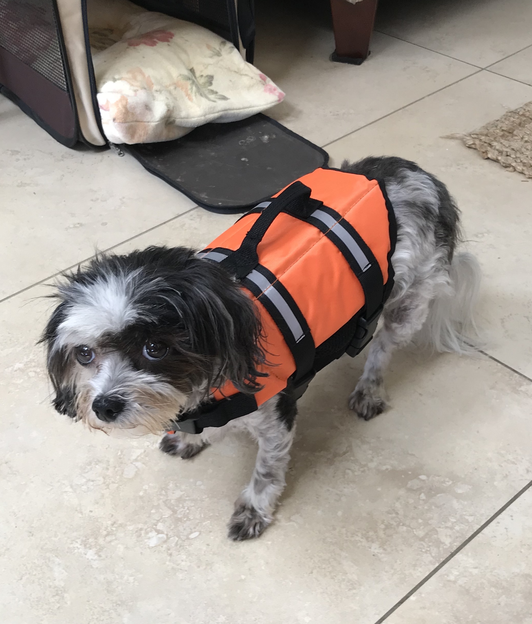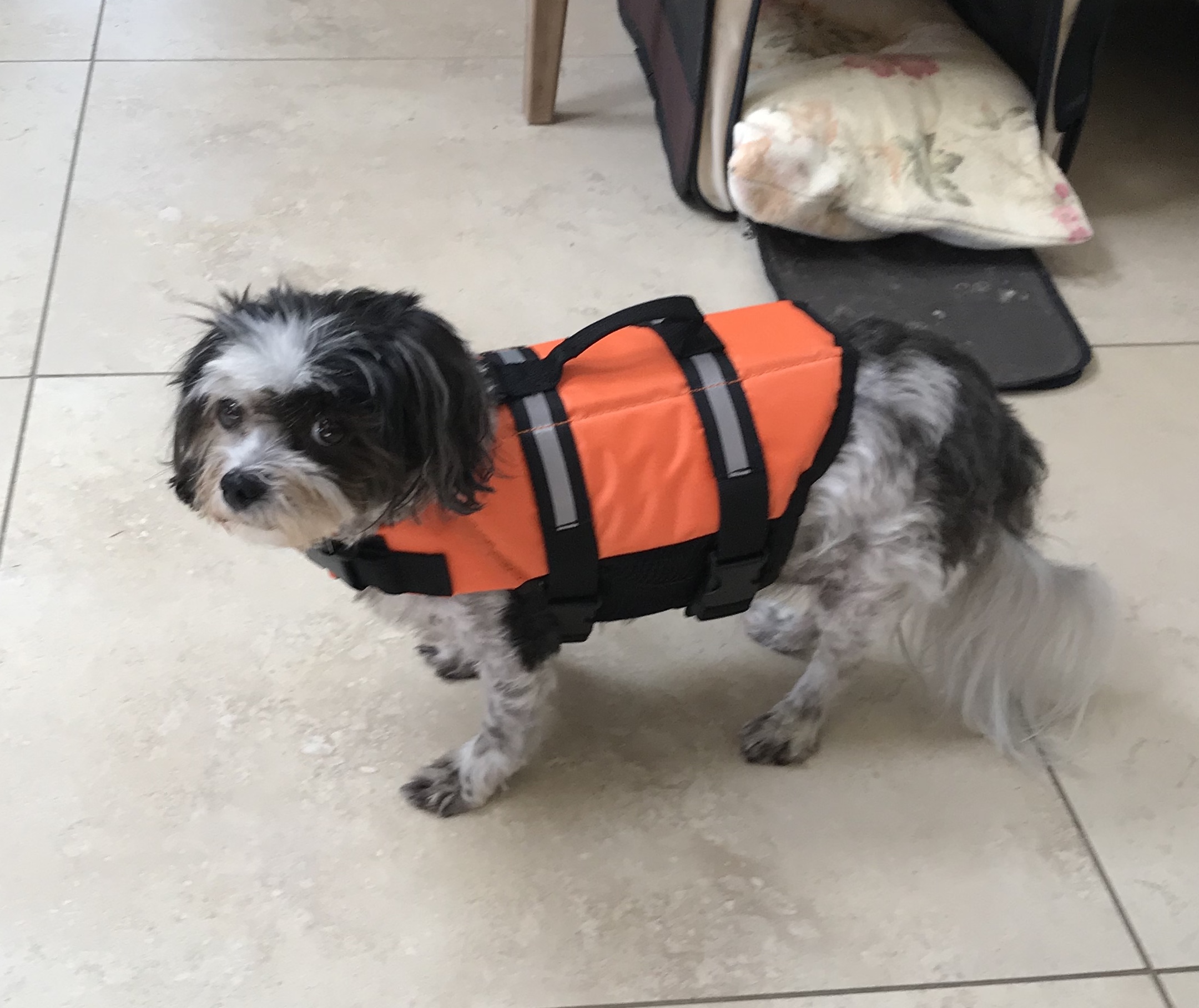 Bath time in the laundry is always a challenge because she sits down and hates getting her face wet. As the water hits her head she stands up on her hind legs and grips my arm as though she is going to drown. Considering this I decided a doggy swimming life jacket would be just the ticket as it would make her feel secure but also make her relax enough to paddle.